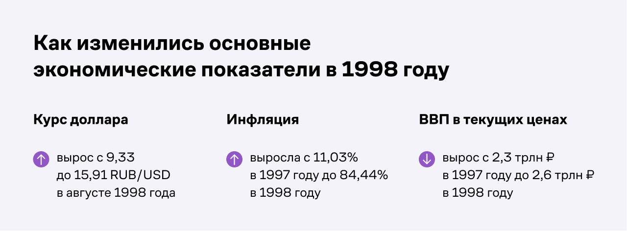 Кризис 1998 года. После развала СССР и реформ 1992 года Россия строила относительно свободную рыночную экономику, распределяла собственность, а также активно заимствовала деньги. Рынок госдолга тогда больше напоминал финансовую пирамиду: для погашения старых займов использовались новые, то есть облигации фактически использовались для спекуляций, а не для поддержки экономики.