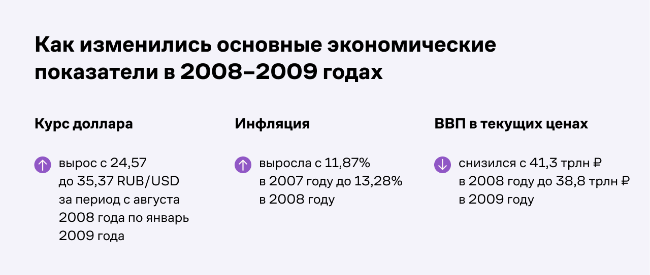 Кризис 2008–2010 годов. В отличие от предыдущего, этот кризис был завезен извне. Российская финансовая система сильно зависела от иностранных банковских структур и поэтому пострадала.