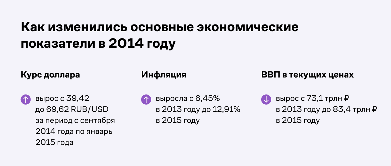 Кризис 2014 года. В начале 2014 года после присоединения Крыма к России западные страны ввели экономические санкции. Одновременно с этим в два раза снизилась цена нефти на мировом рынке. Из-за того, что за границу продавали в основном углеводороды, экономика страны пошатнулась. Выручки от экспорта поступало все меньше.